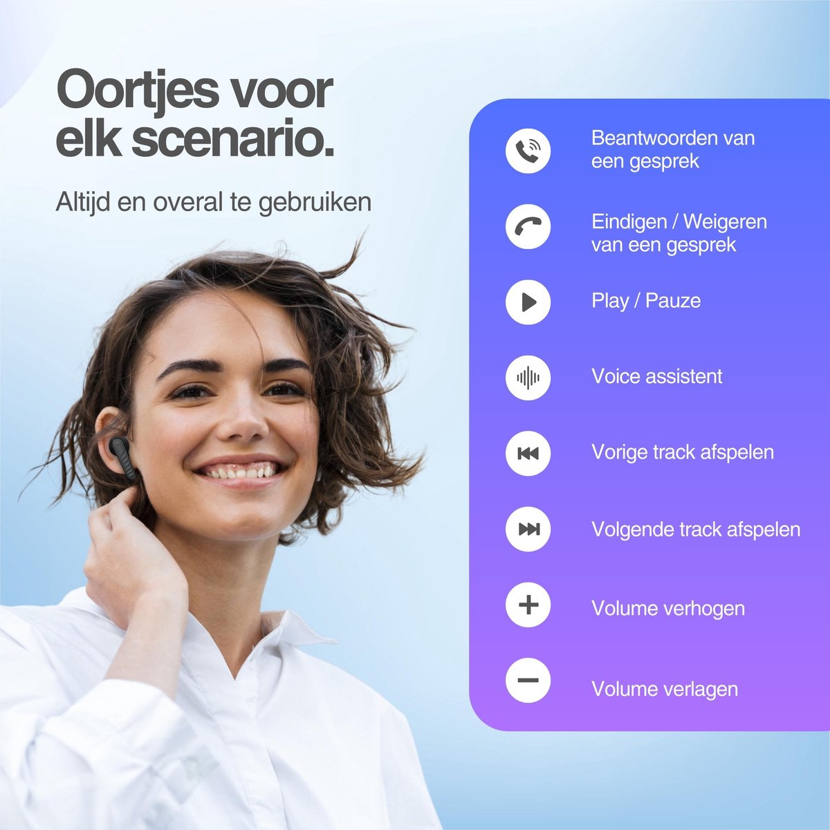 - Handige Touch-Control – Bedien je muziek, activeer spraakassistenten of neem oproepen aan met eenvoudige aanrakingen, zonder je telefoon te hoeven pakken.