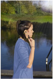 De headset is zweetresistent en ontworpen voor sportgebruik met een ergonomische oorbeugel en een veilige pasvorm, waardoor hij goed op zijn plaats blijft tijdens beweging. Zweetbestendigheid betekent dat hij tegen transpiratie en lichte regen kan, maar hij is niet volledig waterdicht en moet niet ondergedompeld worden. Spoel of droog hem na intensief gebruik en berg hem droog op om de levensduur te verlengen.