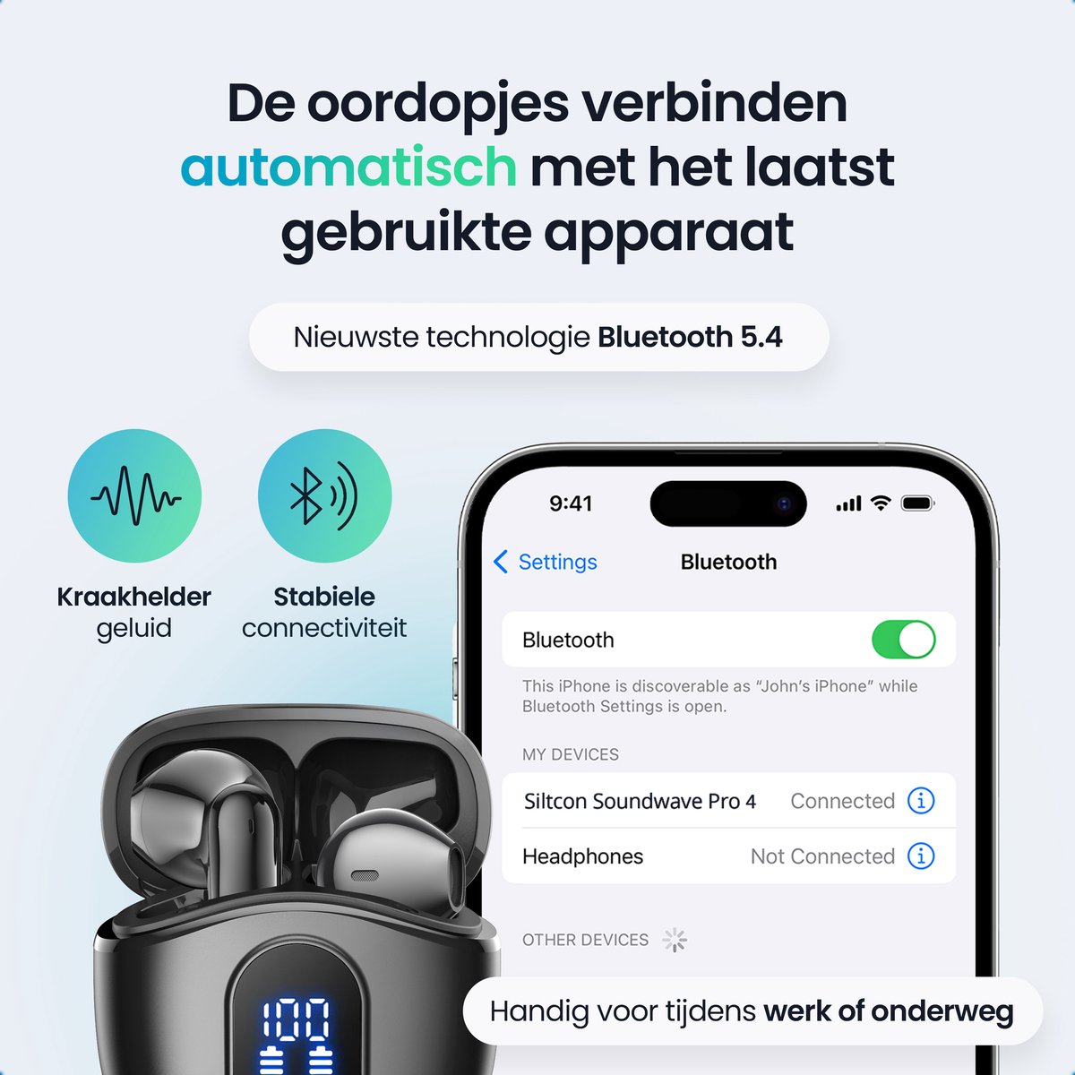 Met de nieuwste Bluetooth 5.4-technologie zorgen de Soundwave Pro 4 oordopjes voor een uiterst stabiele en snelle verbinding tot 12 meter afstand. Of je nu een podcast, je favoriete playlist of een telefoongesprek hebt, je ervaart geen vertragingen of storingen. De automatische verbindingsfunctie start zodra je de oordopjes uit de case haalt, zodat je meteen klaar bent voor gebruik. Dankzij de dubbele microfoons worden je gesprekken helder en ruisvrij gevoerd, zelfs in rumoerige omgevingen.